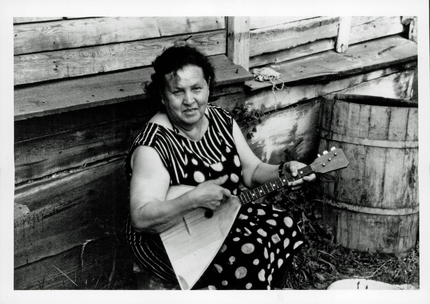 Next, I met an older woman, Galina, a balalaika player, at Lake Baikal, Siberia. An amazing natural talent, home taught in her village. A folk player. I’d met her son at the lake and he’d invited me to lunch with his family up in the hills at their dacha. They only spoke Russian. I was the first American they’d ever met. She was the first Russian folk player that I met. But I knew she didn’t want to start a band with me.
