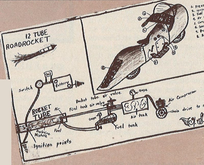 To prepare his prototype “rocket,” he capped one end of a two-foot-long, four-inch-in-diameter steel pipe and packed it with black powder mixed with dirt to lessen its explosiveness. This was essentially a pipe bomb. But he was trying to be conservative. An earlier design called for an air compressor and pressure tank to inject fuel into the tubes, and another idea was to test all 12 rocket tubes at once. The ignition system for this concoction was a single switch with a battery on one side and a coil on the other, leading to a set of points in the steel tube. With the tube secured to a fence post and his mother away from home, Humboldt threw the switch and ducked behind the garage.