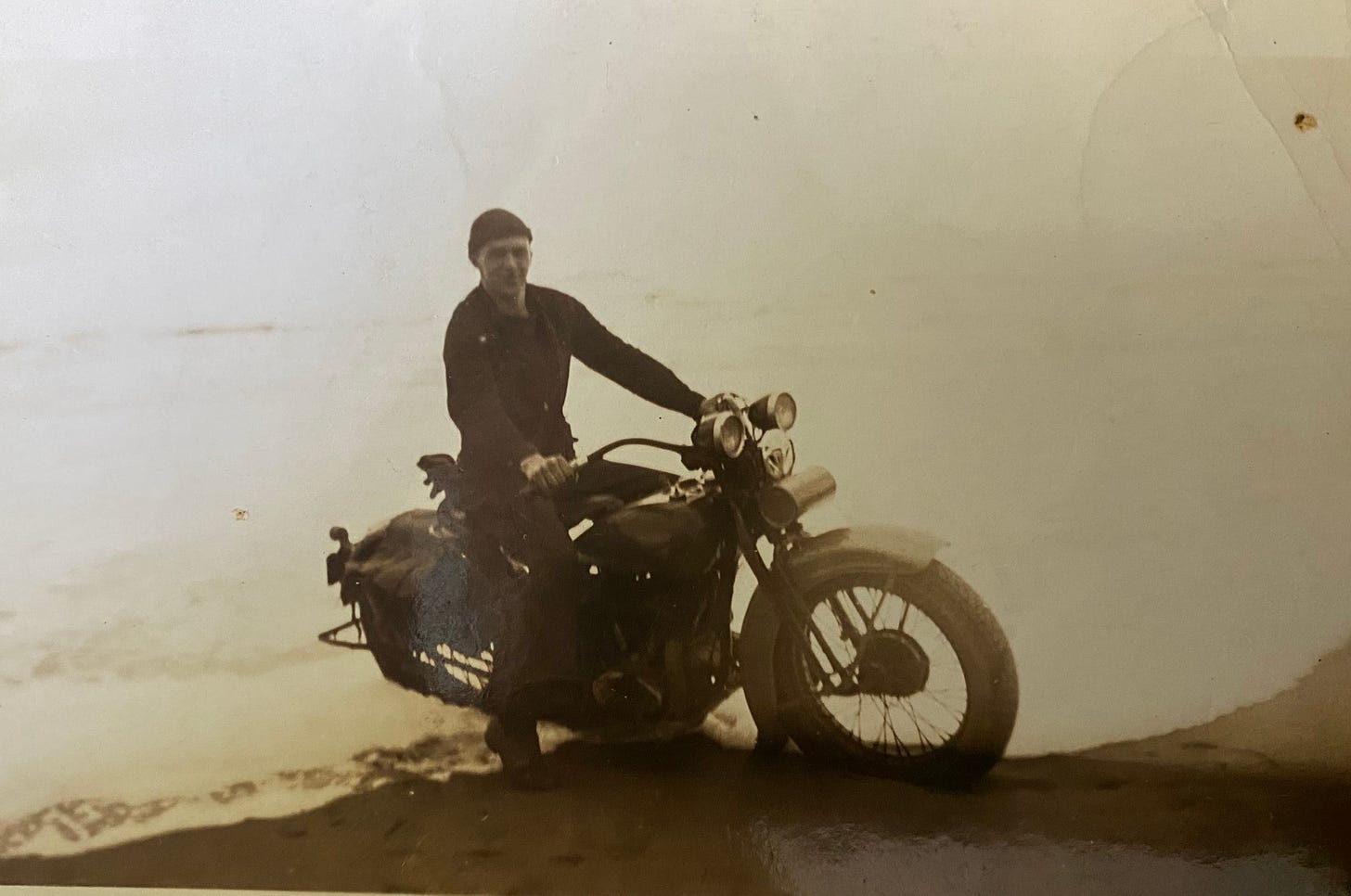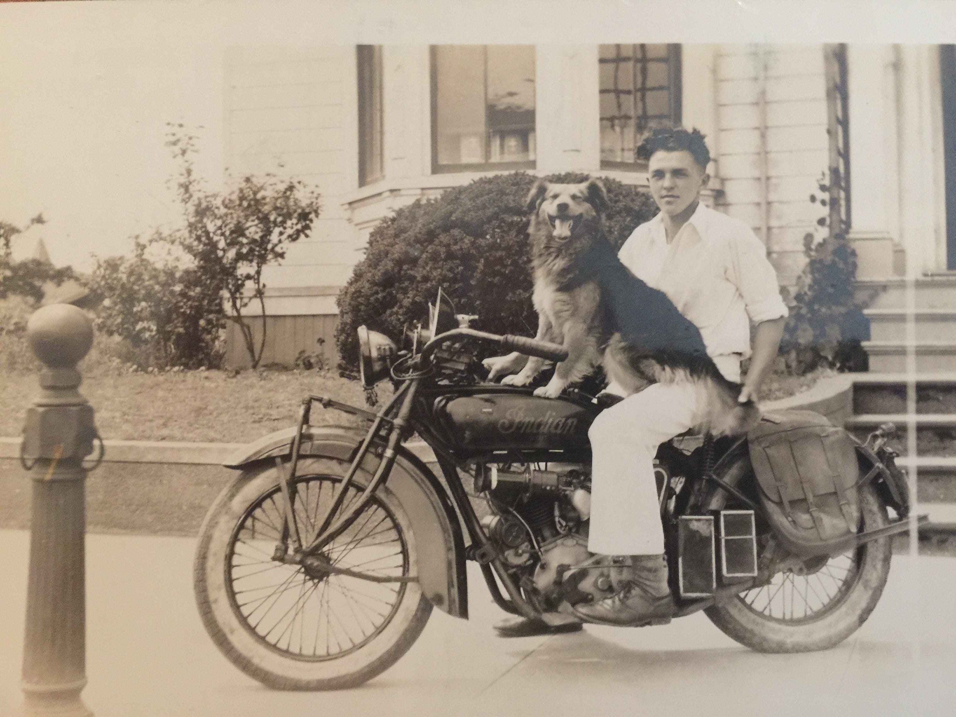Humboldt and his dog Teddy on his Indian Scout motorcycle in front of the family home in Eureka, California, around 1930 - Gates Family Collection