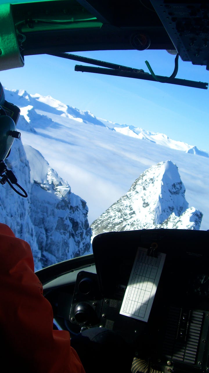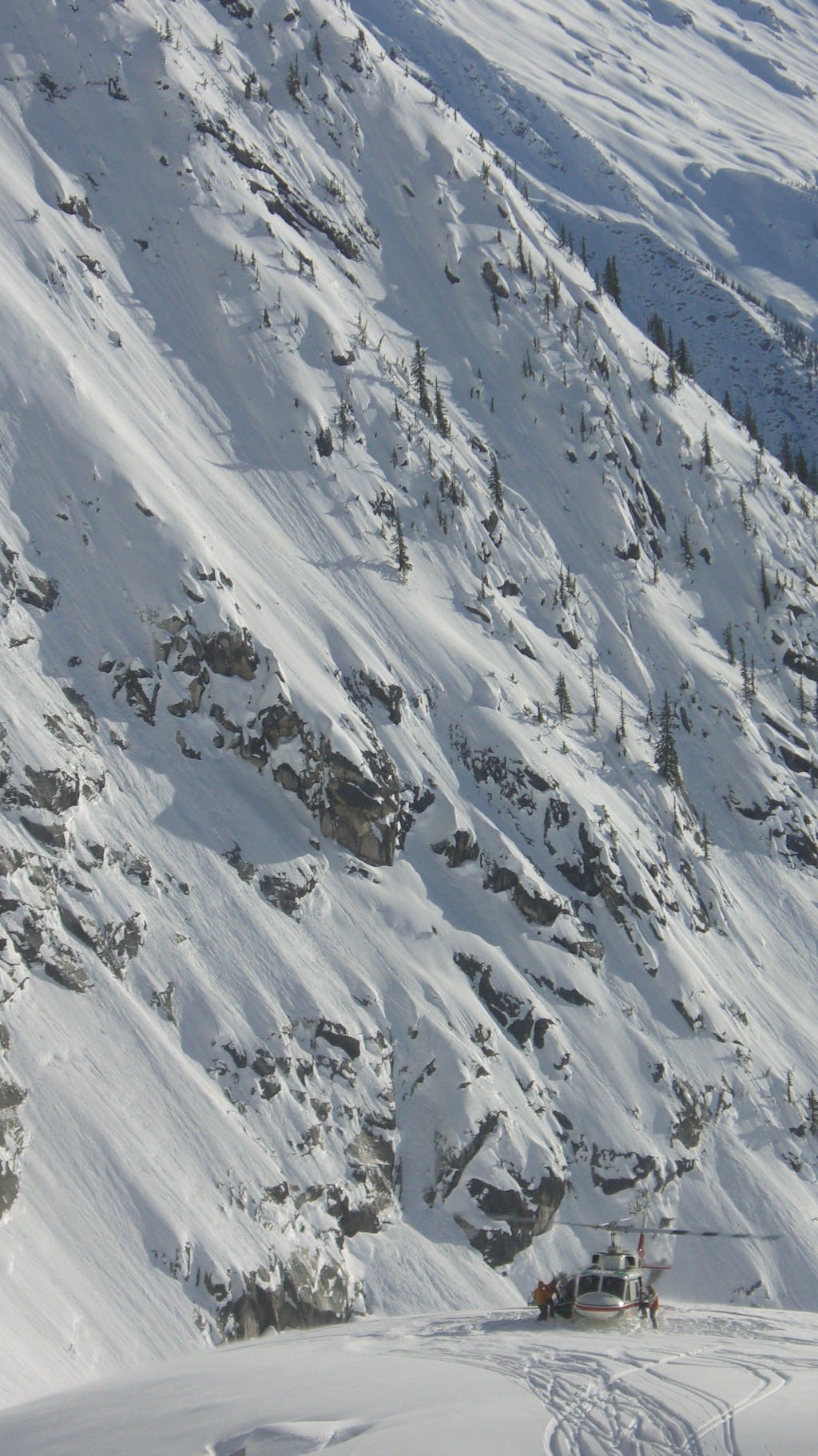 Helicopter climbs alongside canyon walls are exhilarating. Pilots call this ‘hand railing,’ when they come in close to a rock wall and ascend up the steep snow slope toward a gaping saddle far above. At first you think the blades are only a couple meters from the walls. You are so close. The machine vibrates under the power of twin turbo engines. The moment you crest the saddle, terrain falls away abruptly and you start to glide down. The blade frequency sounds less tense on the decent than on the climb.