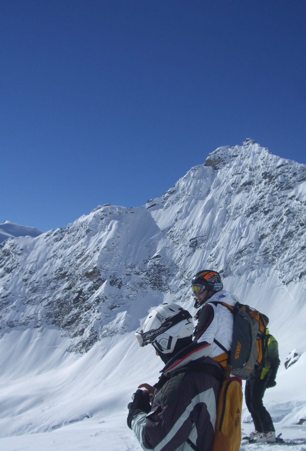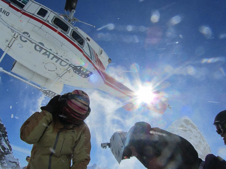 You get dropped off on precipitous mountain ridges where the air is very thin, hard to breath, or on glacial fields far above tree line. The thump of rotors break the silence. You snap into your skis. Helicopter blades create gale force winds that hurl ice pellets. Snow capped peaks jaggedly disperse as far as you can see, like the world may end out there, or not. The helicopter thunders off and leaves you in silence. You drop over the edge, the first descent, the hardest. You feel tight on the steep fall line.