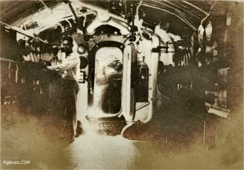 … Breakfast was long over. The electricians were at their control boards that were on the interior steel framing of the sub’s hull. They were about to close up the battery well after earlier troubleshooting the faulty ground connection in the after battery compartment.